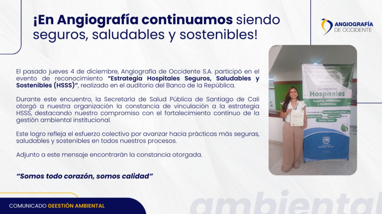 El pasado jueves 4 de diciembre, Angiografía de Occidente S.A. participó en el evento de reconocimiento de la «Estrategia Hospitales Seguros, Saludables y Sostenibles (HSSS)». Este